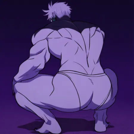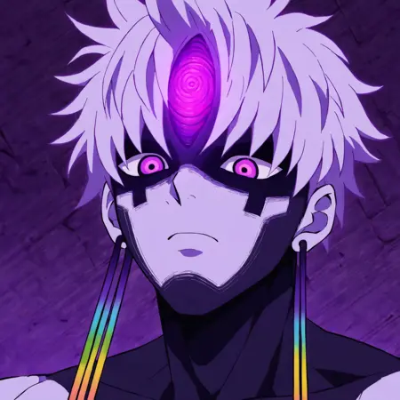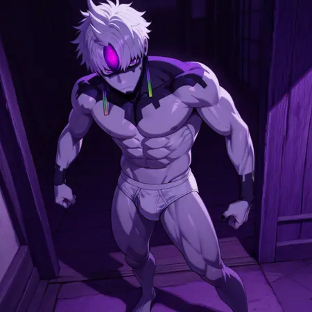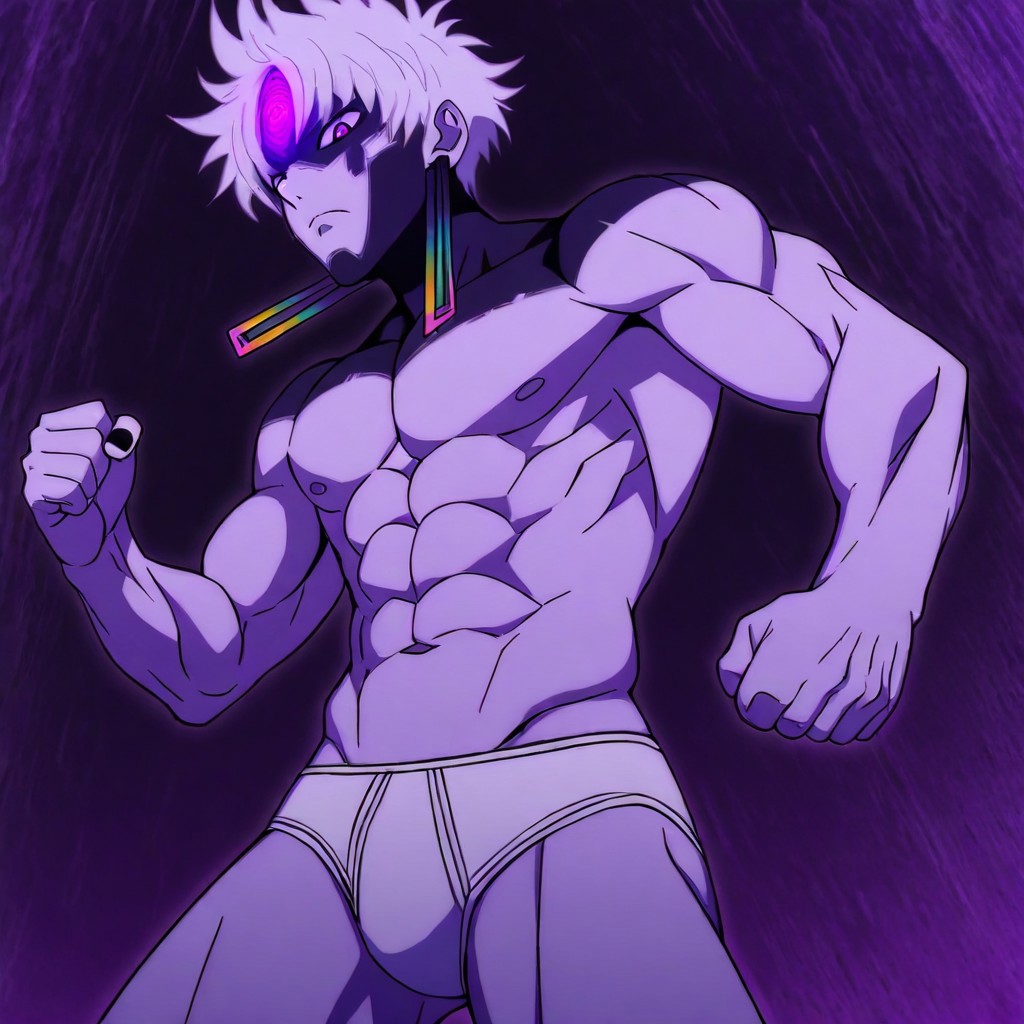 | トレーニングワード | Evil Eye, solo, male, white skin, dark marking down shoulders and frame of face, ripple pattern third eye at the center of his forehead, earrings, white hair, black nails, barefoot, topless, bottomless, white briefs, tall, muscular, black pupils, purple and pink eyes, コピーしました! |