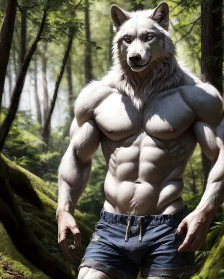 anthro (white wolf), male, adult, muscular, veiny muscles, shorts, tail, (realistic fur, detailed fur texture:1.2), detailed background, outside background, photorealistic, hyperrealistic, ultradetailed,