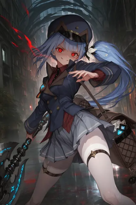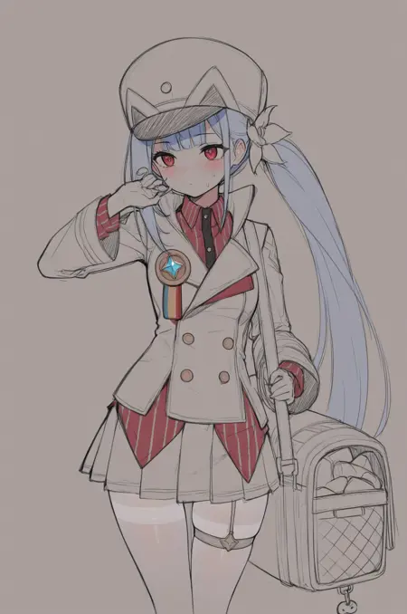 hat, red_shirt, striped_shirt, skirt, jacket, single_garter_strap