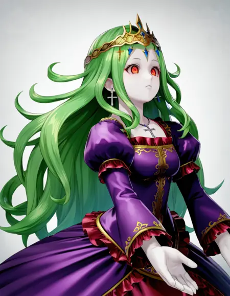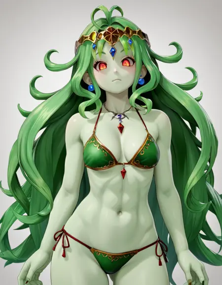 While her upper body, including her flowing green hair and large chest, is reproduced with high fidelity, her iconic cage-like lower body may not render accurately depending on the prompt and model used.