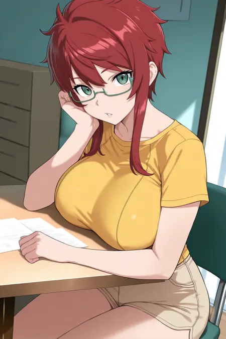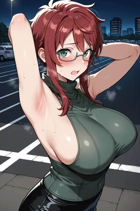 Add "glasses, under-rim eyewear, sleeveless turtleneck, green sweater, lab coat, pencil skirt, black skirt, miniskirt, fingerless gloves, black gloves, pantyhose" for her typical look.
