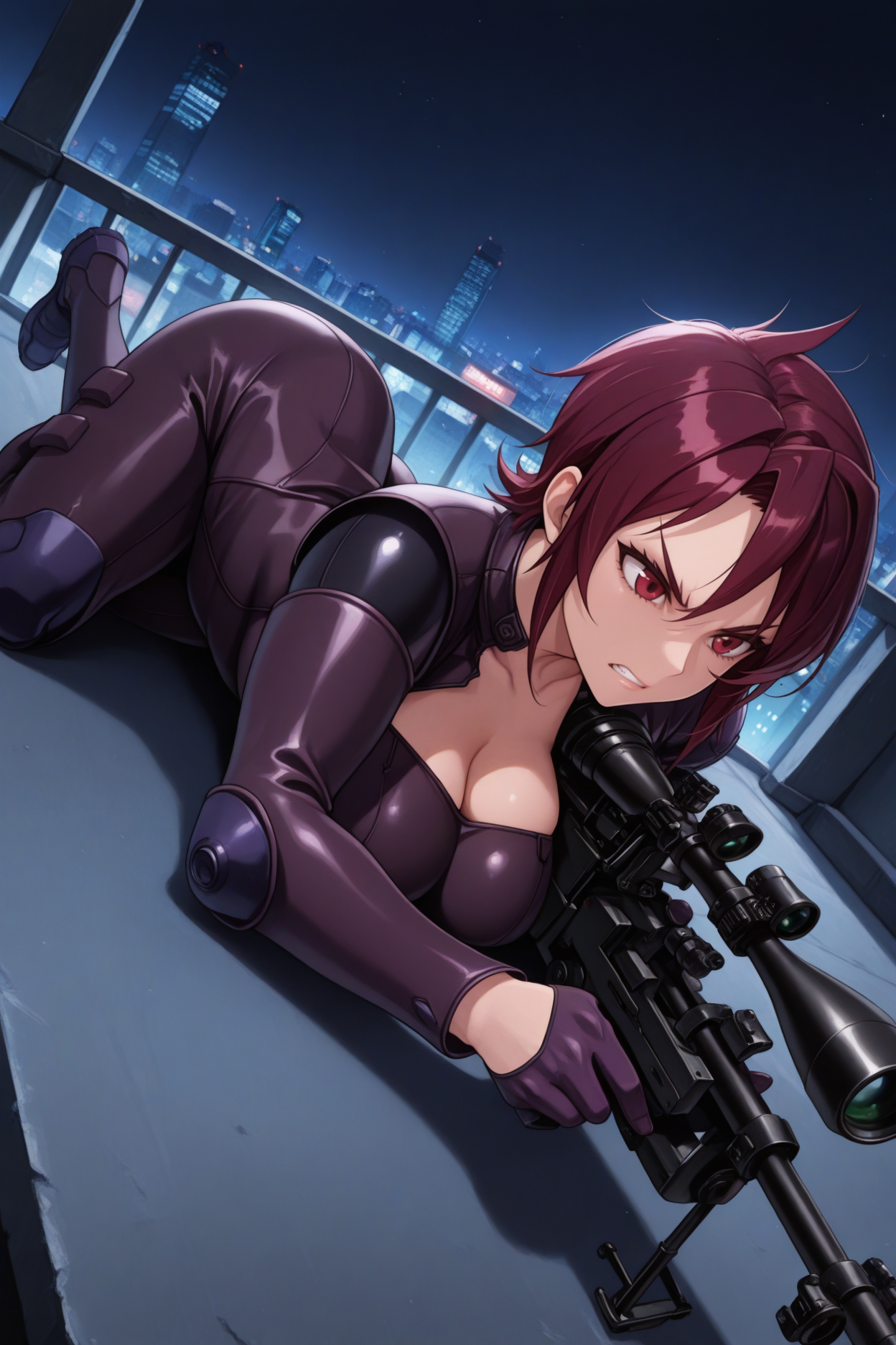 - 전투 복을 원하면 "어두운 보라색 바디수트, 가슴 노출, 어두운 보라색 장갑"을 추가하세요.