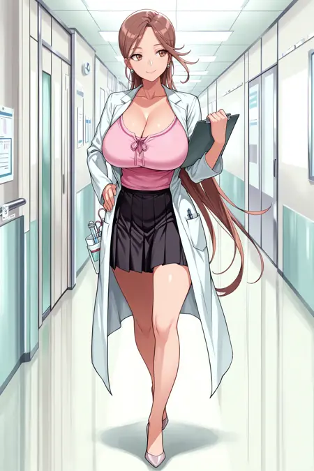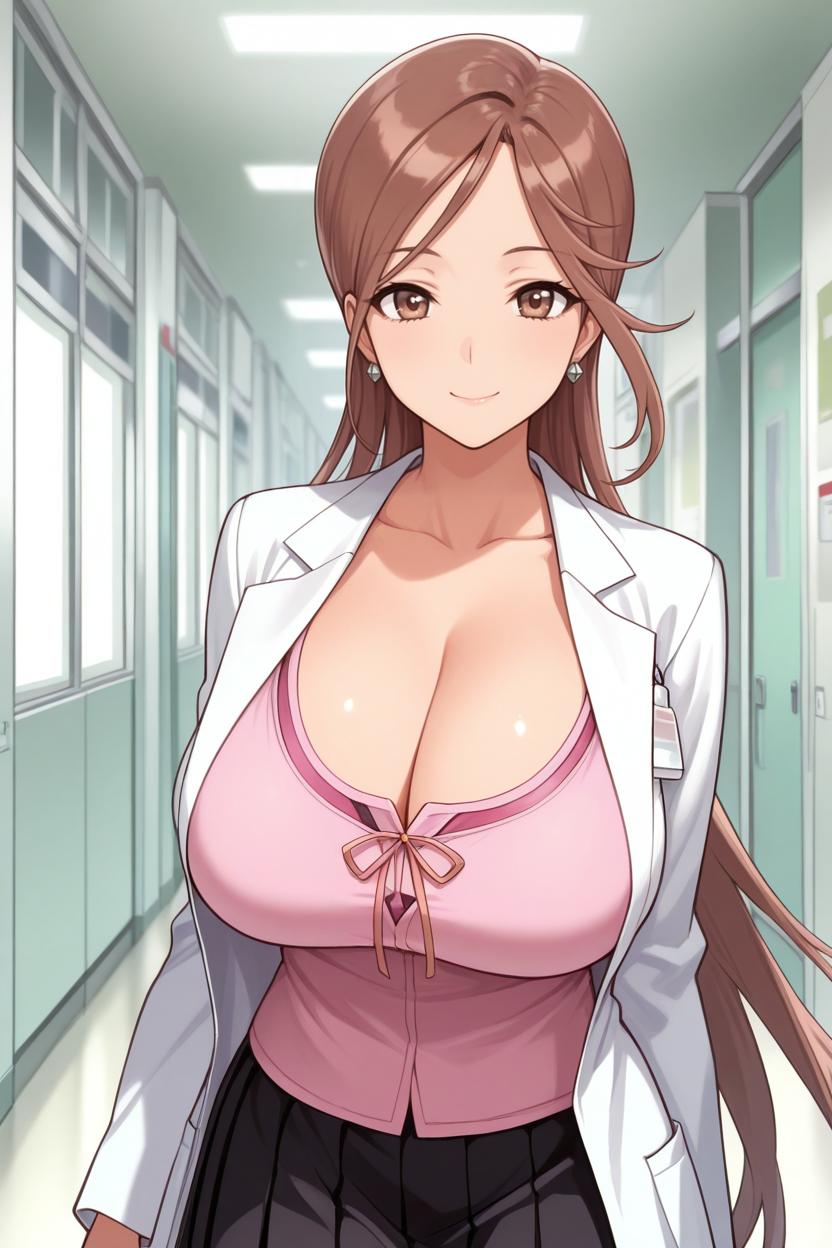 일상복을 원할 경우 "sgyu, 매우 긴 머리, 갈색 머리, 갈색 눈, 귀걸이, 실험복, 분홍색 셔츠, 리본, 가슴line, 검은색 치마, 주름치마"를 추가하세요.
