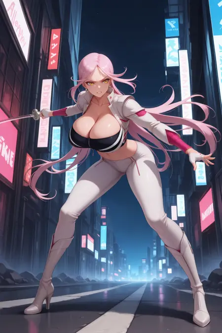 전투복을 원할 경우 "sgyu, 매우 긴 머리, 분홍색 머리, 노란색 눈, 귀걸이, 데리골드, 가슴line, 흰색 재킷, 짧은 재킷, 긴 소매, 검은색 크롭탑, 스트랩리스, 복부, 흰색 바지, 흰색 장갑, 손가락 없는 장갑, 흰색 부츠, 하이힐 부츠"를 추가하세요.