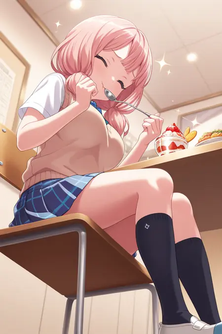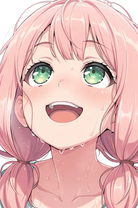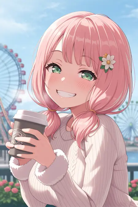 ueharahimari, 1girl, solo, skirt, pink hair, low twintails, necktie, twintails, jacket, green eyes, smile, school uniform, looking at viewer, blazer, grey jacket, green skirt, pleated skirt, plaid, plaid skirt, shirt, striped necktie, white shirt, haneoka school uniform