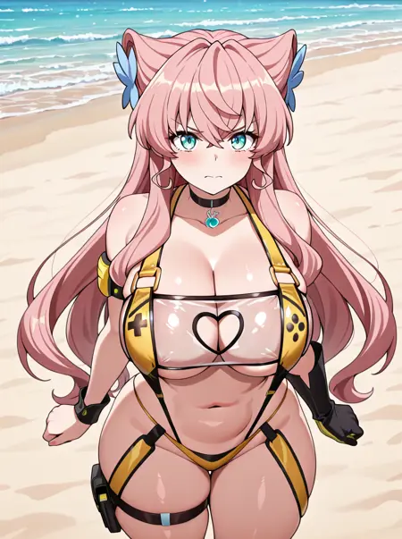 Boom and Shock: eleggboom, swimsuit, cleavage cutout, bikini, hair intakes suspenders,,armband, thigh strap, front_view, see-through clothes, skin fang, choker, rabbit choker,