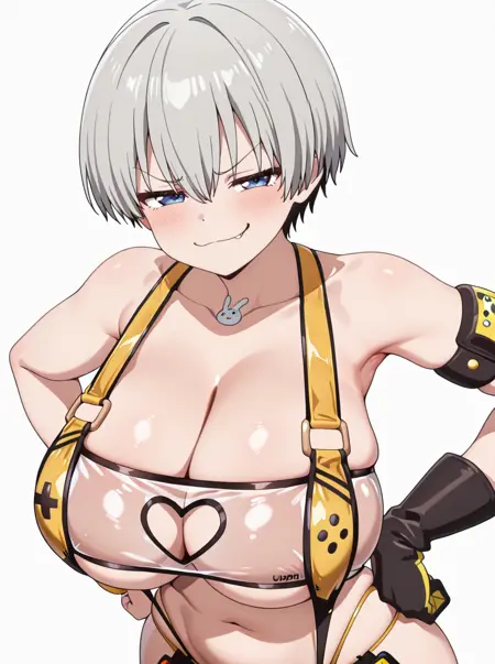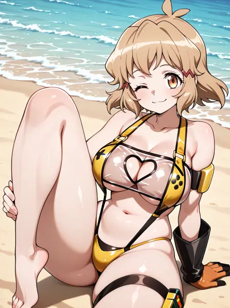 프롬프트: breasts, 1girl, blonde hair, swimsuit, short hair, hair over eyes navel, large breasts, single glove, cleavage, ahoge, hair intakes, multicolored hair, see-through clothes, blunt bangs, thigh strap, side_straps