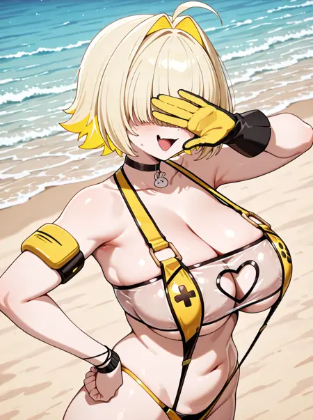 Prompts breasts, 1girl, blonde hair, swimsuit, short hair, hair over eyes navel, large breasts, single glove, cleavage, ahoge, hair intakes, multicolored hair see-through clothes, blunt bangs, thigh strap, side_straps
