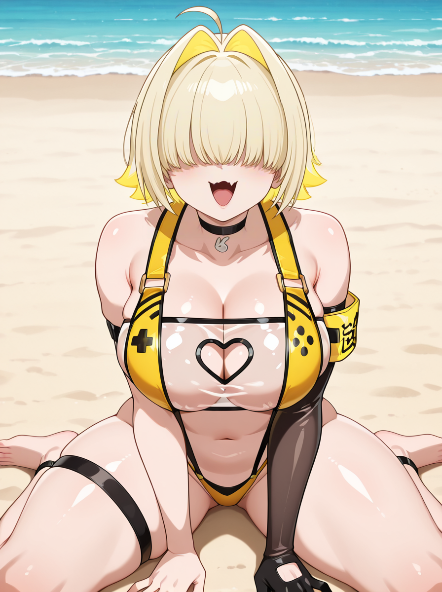 Main prompts: 1girl, blonde hair, solo, breasts, short hair, hair over eyes, (Add or remove purple eyes)