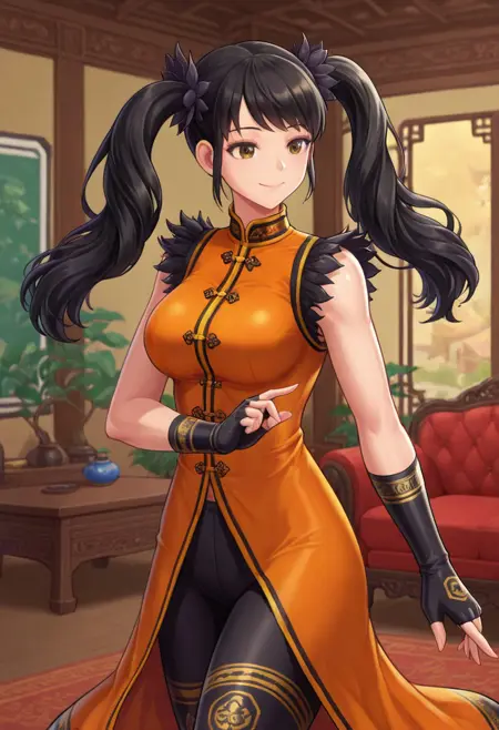 Ling Xiaoyu,1girl,solo, black hair,long haiir,twintails, black leggings, chinese dress, orange dress, black feather epaulettes, sleeveless, orange shoes, black wristband, black forearm glove, fingerless glove,