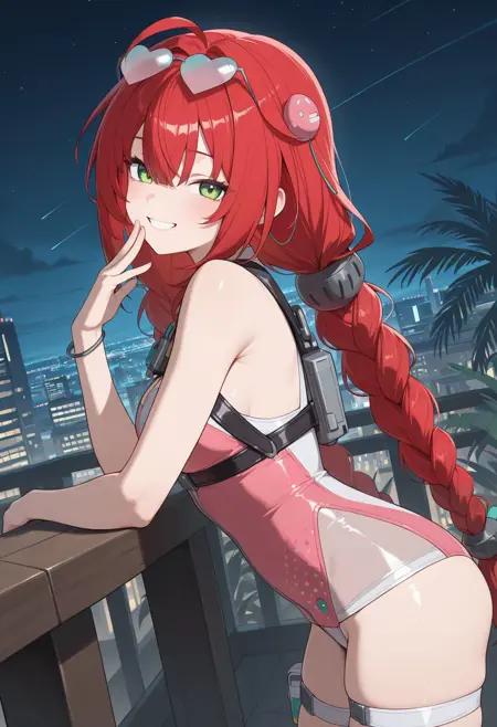 泳装服装:yuzuhaaltcos_, 1girl, solo, 长发, 红发, 双马尾, 发丝遮眼, ahoge, 刘海, 绿眼, 连体泳衣, 半透明, 背带, 大腿绑带, 眼镜戴在头上, 双色连体泳衣