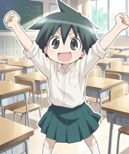 tomokane, girl, black eyes, dark green hair, short hair, school uniform, red jacket, white shirt, green neck ribbon, green skirt, white socks, shoes,