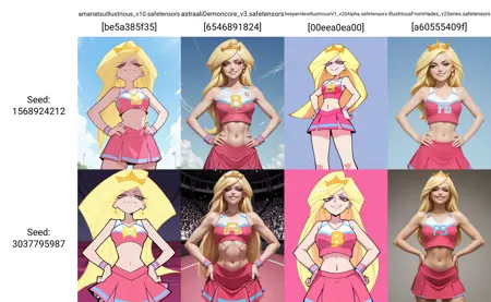 Basic Prompt for cheerleader look: psg_queen_barby, cheerleader_outfit, navel, skirt, B
