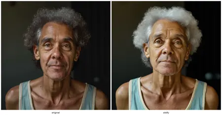 Oldifyは、自然な人間の老化をシミュレートするための生成型LoRAです。しわ、肌のたるみ、体積の減少、髪の白髪化といった現実的な老化の兆候を加えながら、元の被写体のアイデンティティ、照明、構成を保持します。
