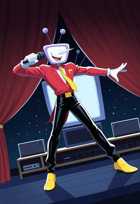 red jacket, yellow necktie, white shirt, white gloves, black pants, belt, yellow shoes