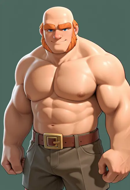 肌肉发达,橙色头发,长鬓角,浓眉,面部胡须,秃头,蓝眼睛,无袖长袍,腰带,短裤,