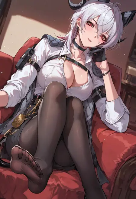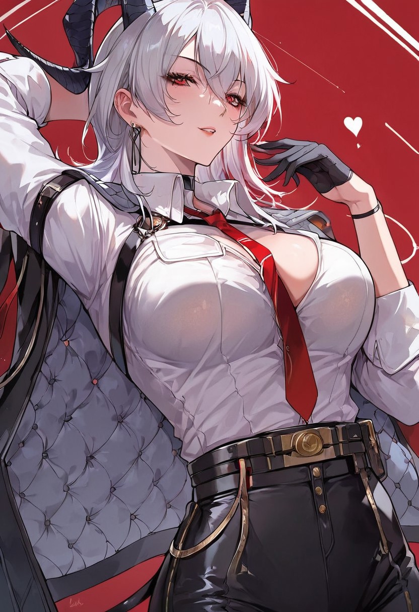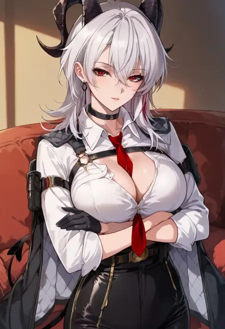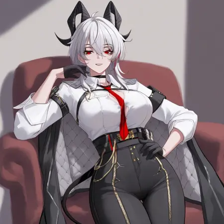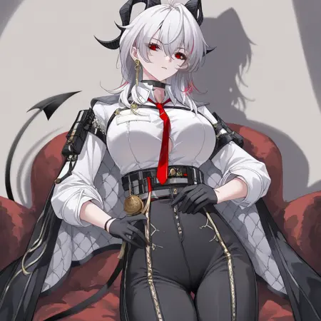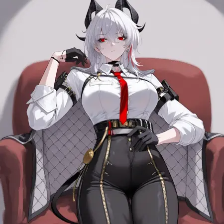 | 训练词汇 | Base: Zani, white hair, medium hair, pale skin, dark red eyes, slitted pupils, horns, slim tail, large breasts,已复制! Outfit: high-collared white shirt, red tie, black choker, black half‑palm gloves, tight black high-waist pants, golden zips mid-thigh, strapless black high heels with red soles, black pantyhose, black leather chest harness, golden details, black jacket hanging on the shoulders,已复制! |
