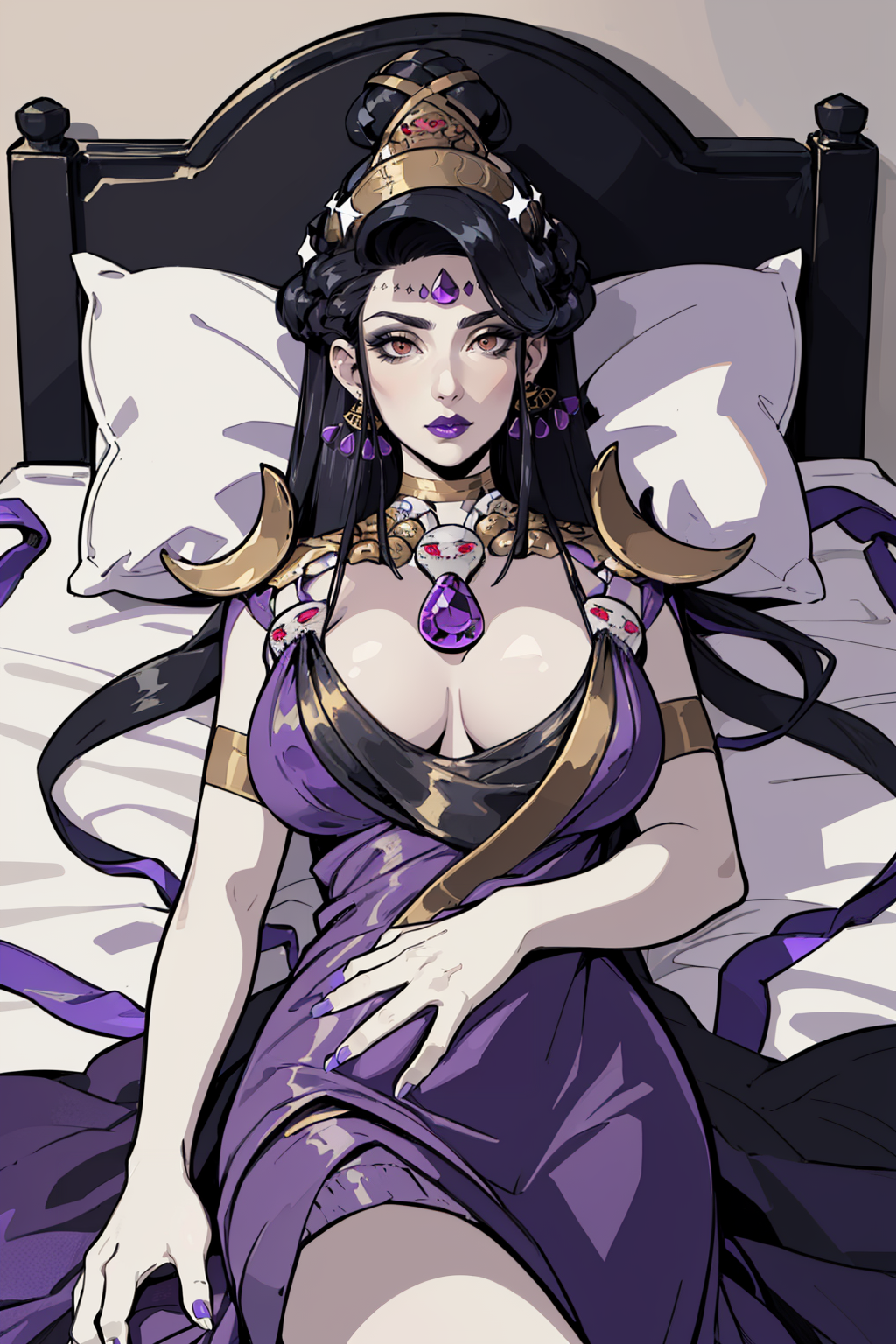 의상 태그: 머리 장신구, 귀걸이, 목걸이, 보석류, 해골, 드레스, 보라색 드레스, 어깨 패널