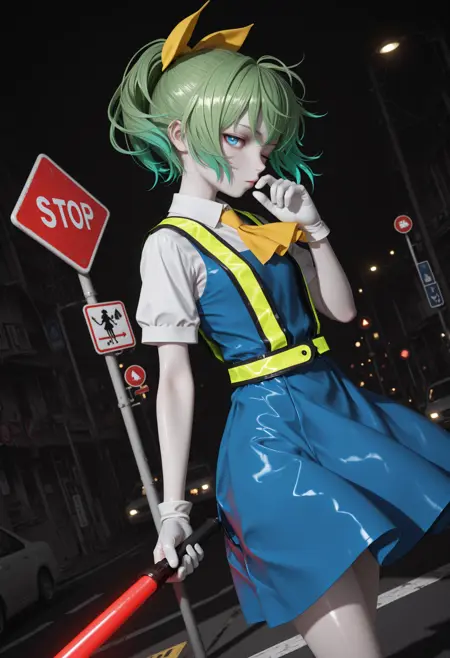 | 训练词汇 | diyusi, green hair, ponytail, hair bow, yellow bow, pale skin, closed eyes, yellow ascot, blue dress, white shirt, white socks, white shoes,已复制! high visibility vest, white gloves,已复制! holding, traffic baton,已复制! pedestrian only sign, pedestrian crossing sign, vehicle only sign, bicycle only sign,已复制! |