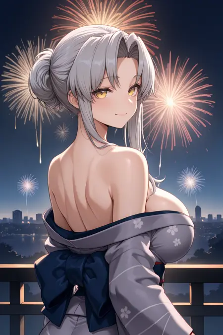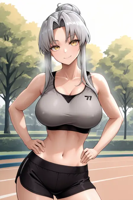 외모: m1k0to, 큰 가슴, 노란 눈, 회색 머리, 커튼 머리, 갈라진 앞머리, 긴 머리