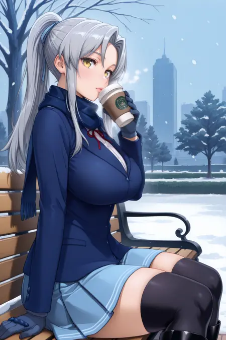 복장: 높은 토끼 꼬리, 머리 리본, 파란 리본, 파란 재킷, 빨간 목 리본, 흰색 칼라 셔츠, 파란 치마, 주름 치마, 미니 스커트, 파란 장갑, 검은 허벅지 양말, 무릎 부츠, 검은 부츠