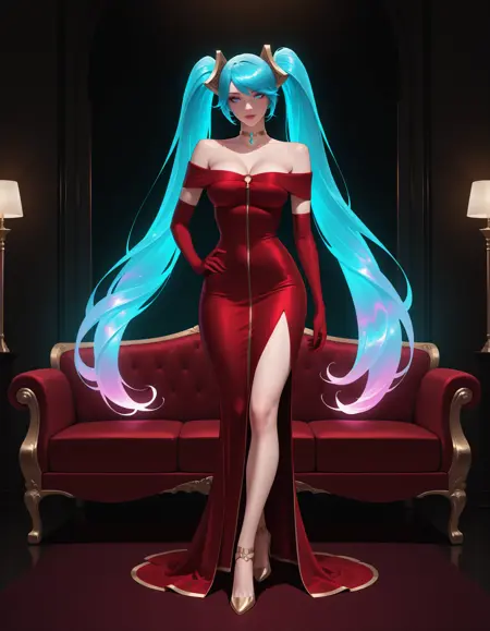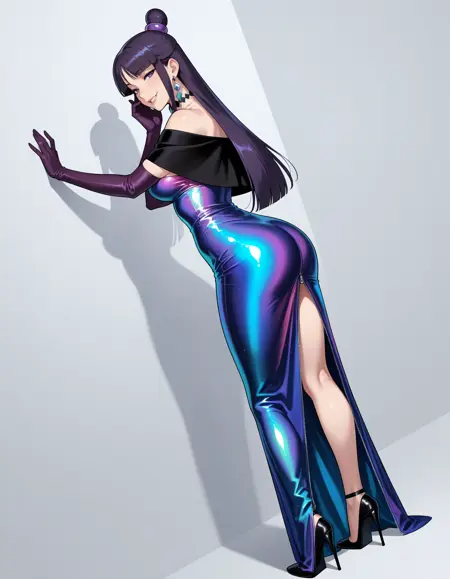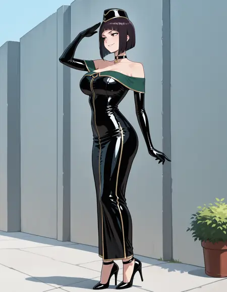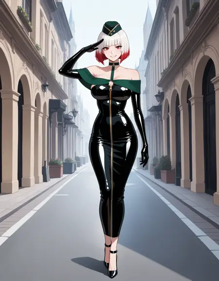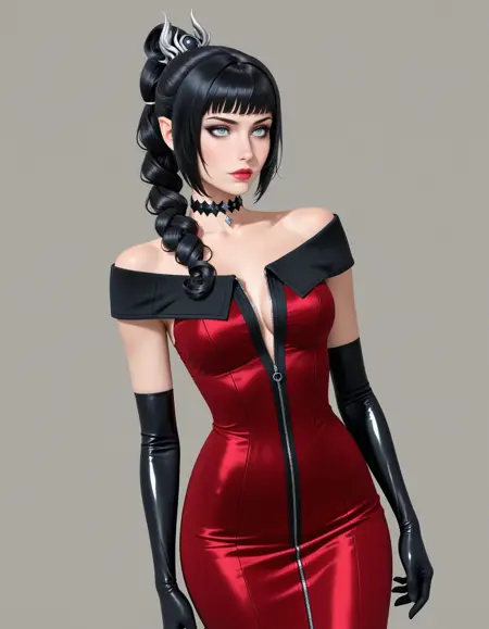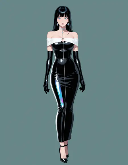 latex clothing, dr3ss, hobble_skirt, iridescent black off-shoulder dress, (capelet), form-fitting, full length zipper, strapless, (white ruffled trim, center trim:1.2), sleeveless, elbow gloves, diamond choker, full body, high heels, (o-ring top)