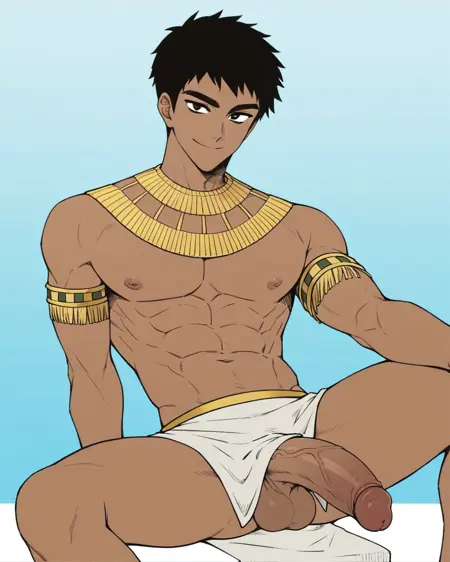 タグ: ennead_horus, 暗い肌, 筋肉質, エジプト風, エジプトの衣装, ジュエリー, アームレット, 短髪, 黒髪, 青い目, 厚い眉