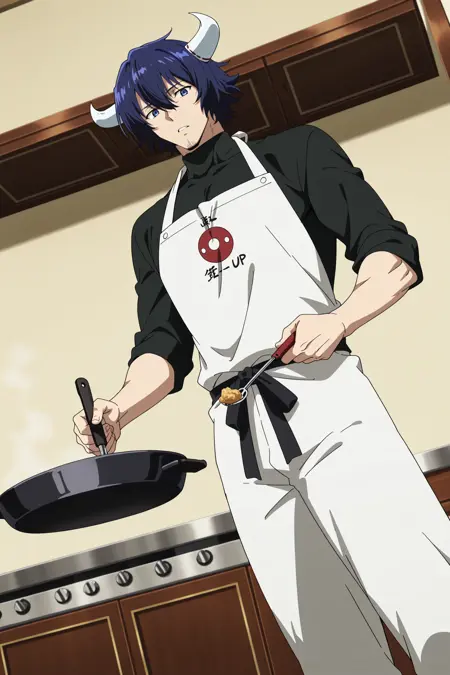 Susanoo, susanoo_akame, blue hair, two horns, blue eyes, hair between eyes, facial hair