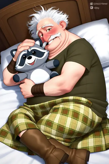 1man,solo,male focus,lord dingwall,short,old man,mature,fat,balding,white hair,mustache,facial hair,bushy eyebrows,brown eyes,brown arm braces,dark green shirt,green plaid clothes,plaid kilts,brown boots,