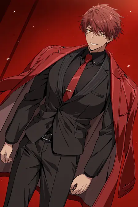 官方备用服装,黑色夹克,黑色衬衫,夹克内穿衬衫,有领衬衫,红色领带,外套搭在肩上,红色外套