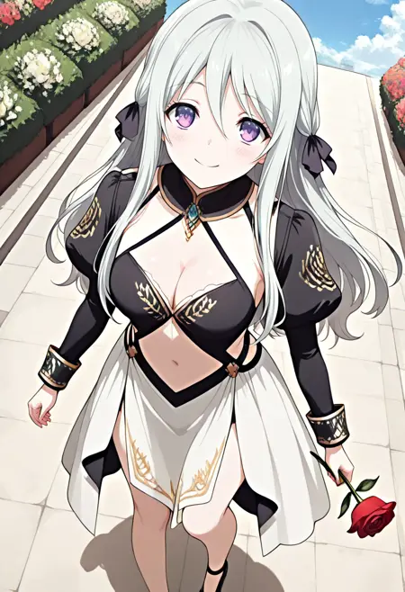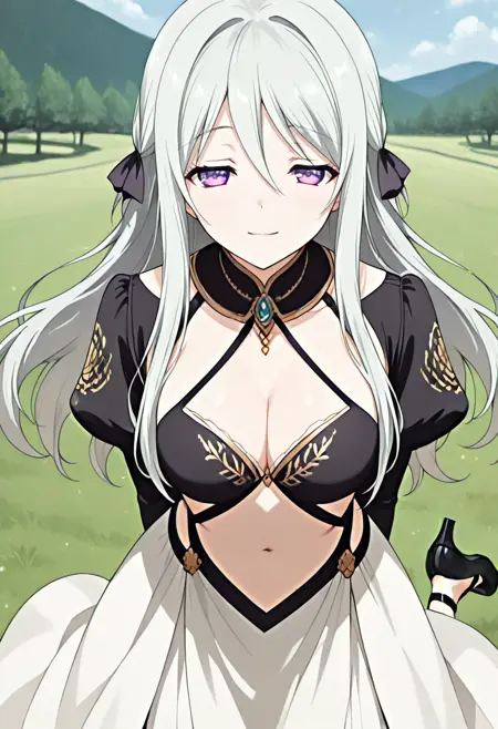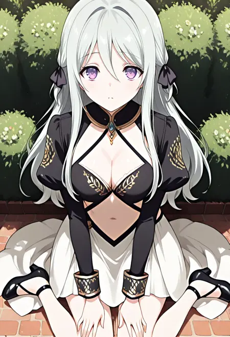 | 학습된 단어 | o5v1, elaborate dress, black dress, white skirt, high-low skirt, asymmetrical skirt, long sleeves, puffy sleeves, cut-out dress, bare back, cleavage, navel, high collar, gold trim, ornate, jewelry, black shoes, ankle strap shoes, high heels, open back, split skirt, armbands복사됨! |