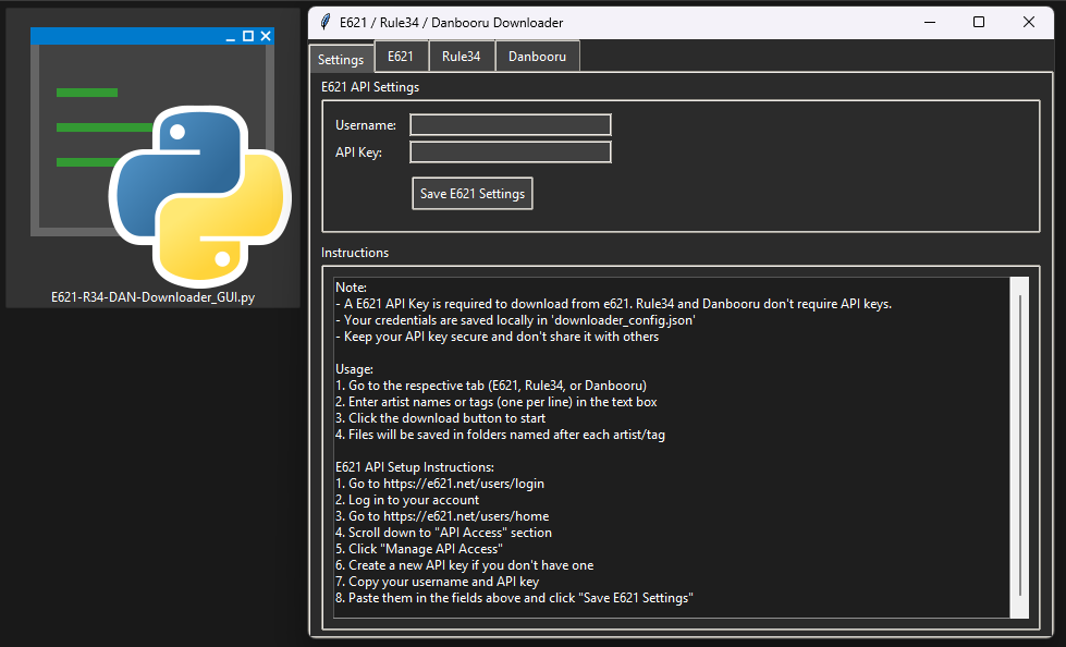 Please note that E621 requires an API key for access. You can generate one by logging into your E621 account, navigating to your account settings, and creating an API key. Once obtained, input the key into the application to enable downloads from E621.