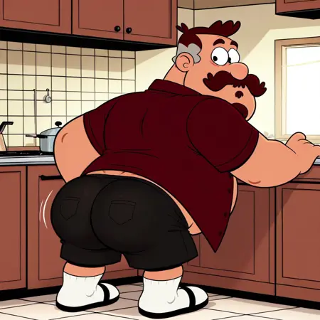Phil, solo, 1boy, mature male, mustache, goatee, brown hair, gray hair on the back of the head, black eyes, black shorts, white socks, fat, maroon shirt with red lining, collared shirt, buttons, black sandals,