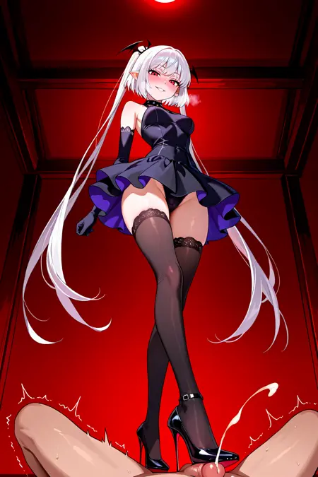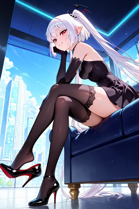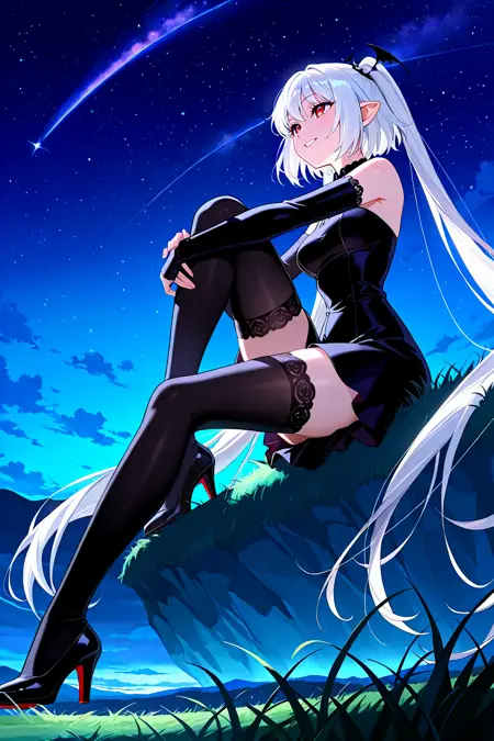 lilo·i, red eyes, white hair, twintails, long hair, pointy ears, very long hair, black dress, detached sleeves, elbow gloves, black thighhighs