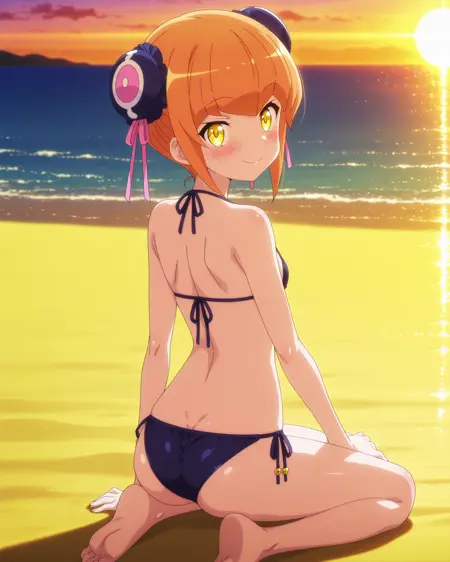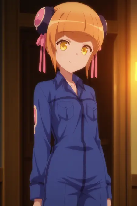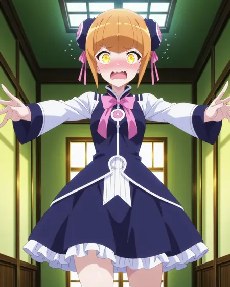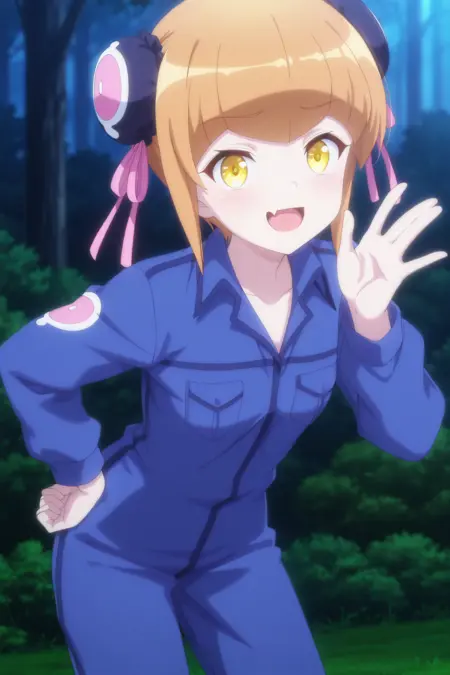 — Bright and energetic, this girl bursts with charm and confidence. With her sharp golden eyes and short orange hair styled into twin buns wrapped in ribboned accessories, she exudes a playful yet orderly vibe. Her outfit resembles a stylish mix of sailor uniform and military design, accented by a large pink bow that emphasizes her cheerful, lively nature.