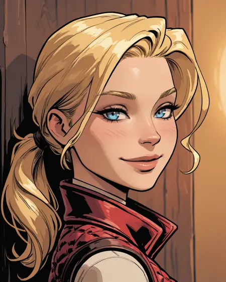 트리거: calicomarvel, 금발, 파란 눈, 꼬리머리, 조끼, 벨트, 바지, 부츠