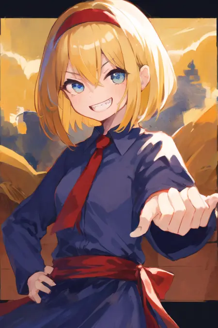 ALCTIS,evil grin,fang,yellow hair,short hair,Red hairband,blue eyes,sharp eyes