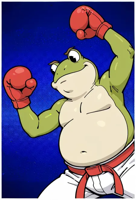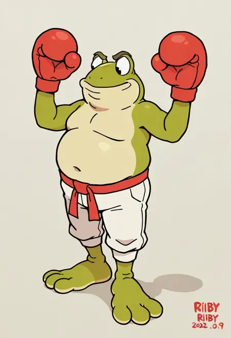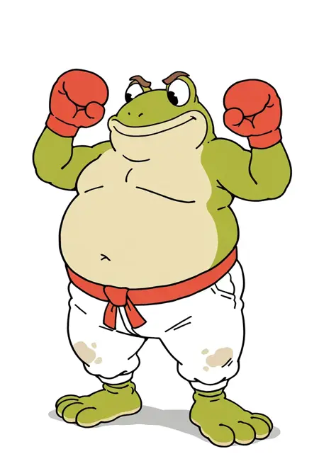 Ribby, 1boy, frog, green skin, cream-colored belly, red boxing gloves, red belt, white pants, black eyes, brown eyebrows, chubby