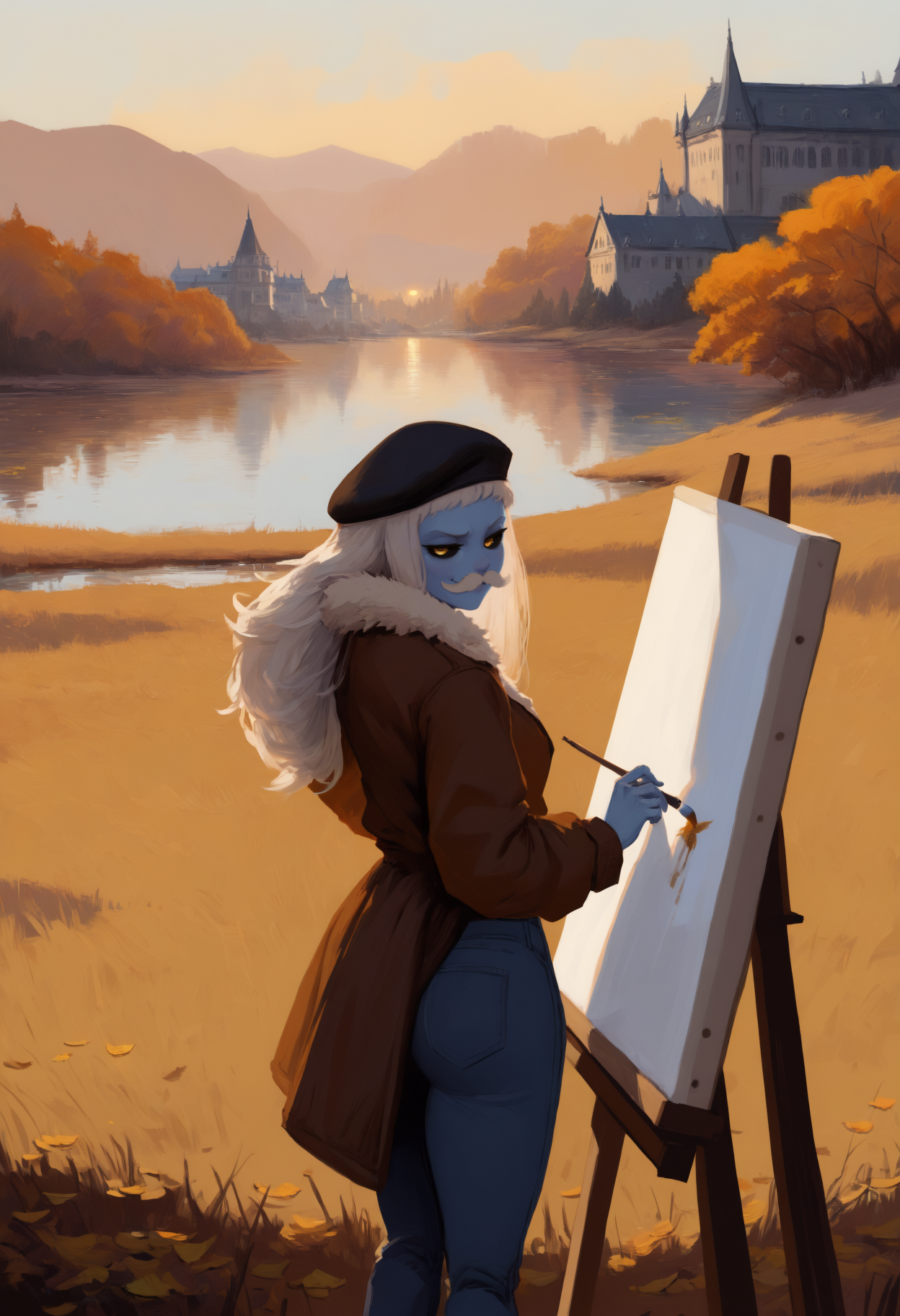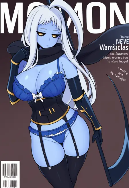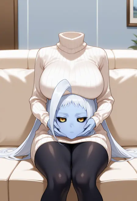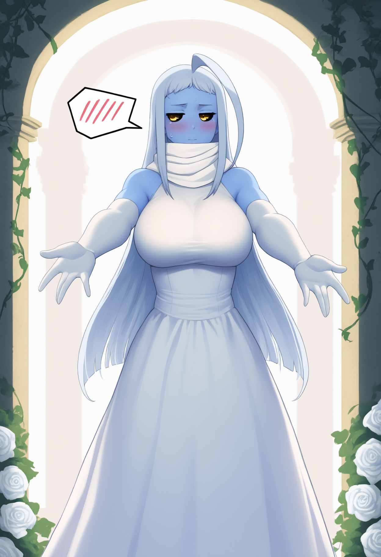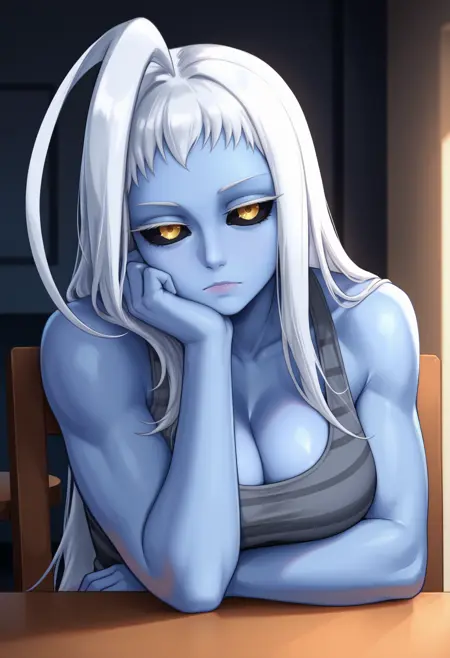 外观: monster girl, blue skin, long hair, white hair, huge ahoge, yellow eyes, black sclera