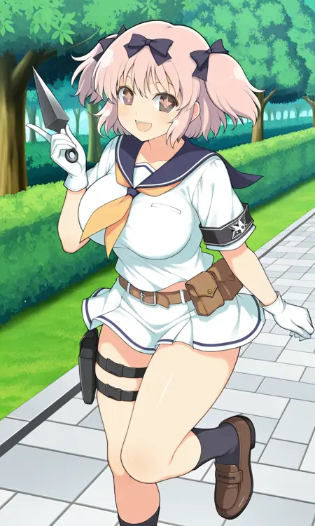 히바리(센란 카구라), 보라색 눈, 십자형 동공, 분홍색 짧은 머리, 짧은 트인테일, 머리 리본, 큰 가슴, 허벅지, 앵클 양말, 팔밴드, 벨트 주머니, 검은 팔밴드, 검은 양말, 파란색 해군 목-collar, 갈색 신발, 장갑, 한조우 아카데미 학교 복장, 총집, 쿠나이, 넥커치프, 공식 대체 복장, 주머니, 해군 목-collar, 학교 복장 셔츠, 신발, 치마, 양말, 허벅지 총집, 무기, 흰색 장갑, 흰색 셔츠, 흰색 치마, 노란색 넥커치프