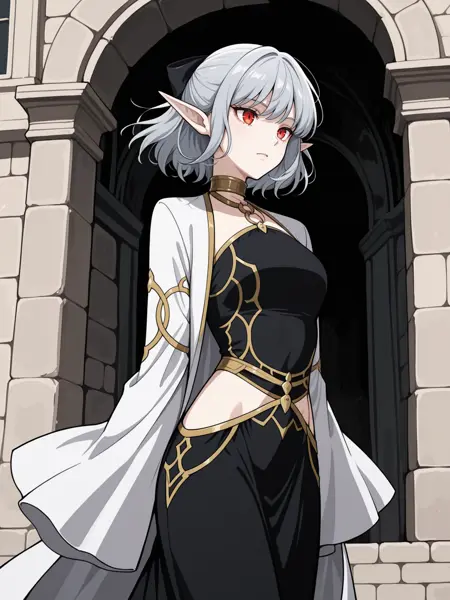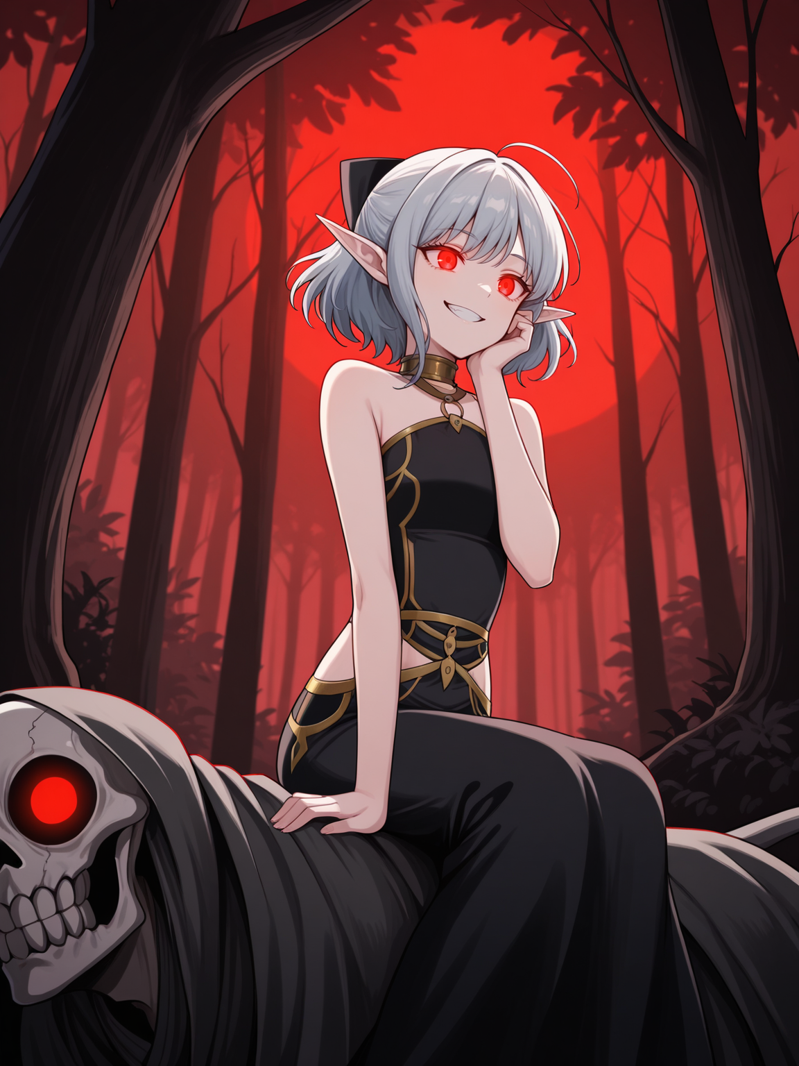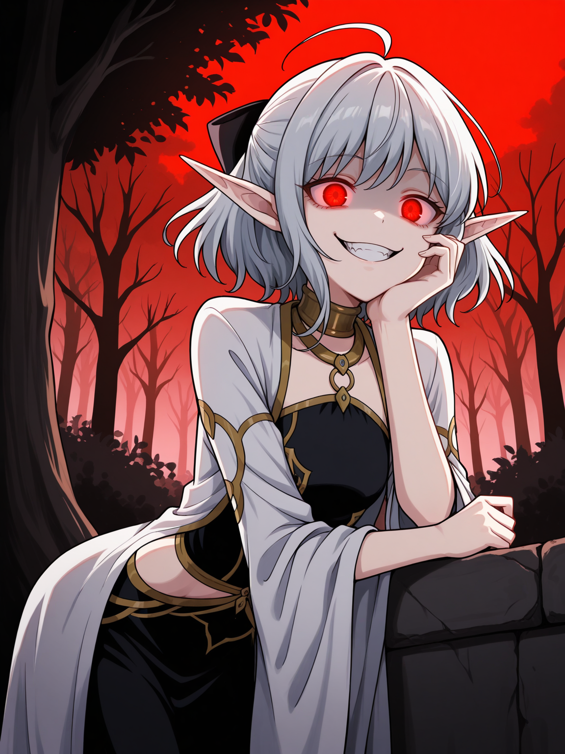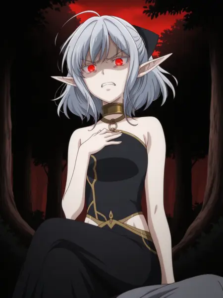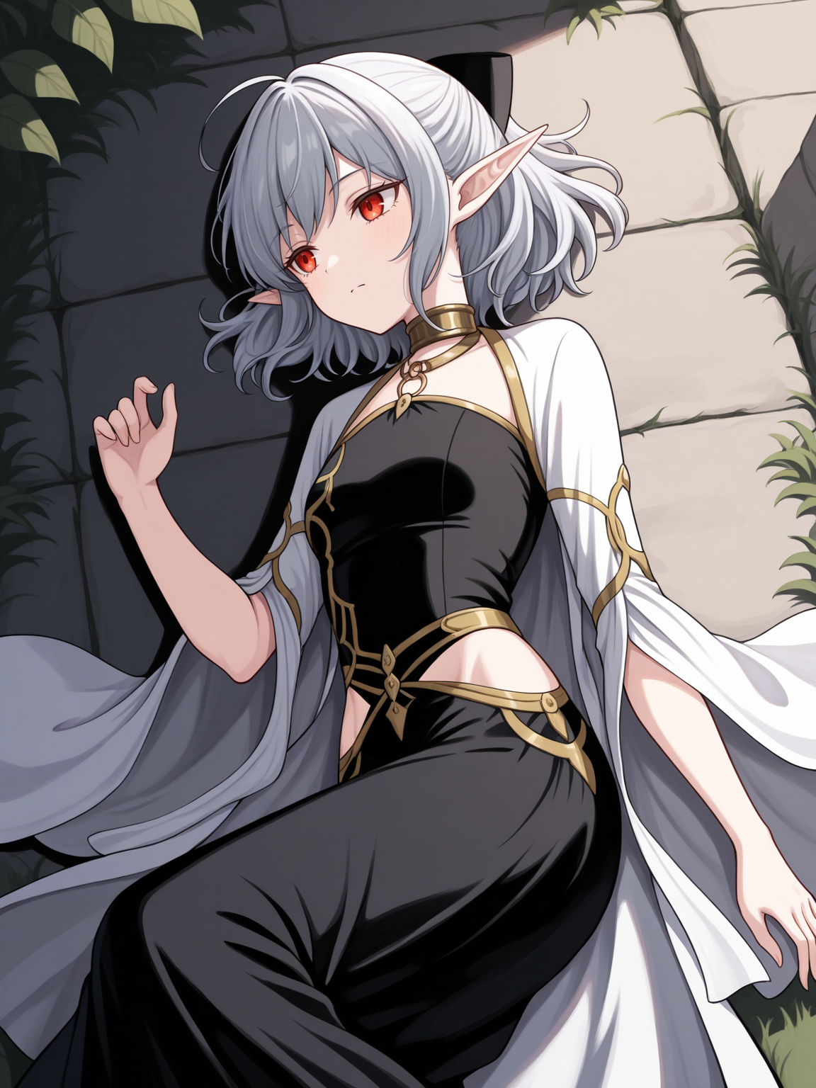 外观:odeinoatou,短发,灰发,红眼,长尖耳,胸部小巧,呆毛,黑色发带