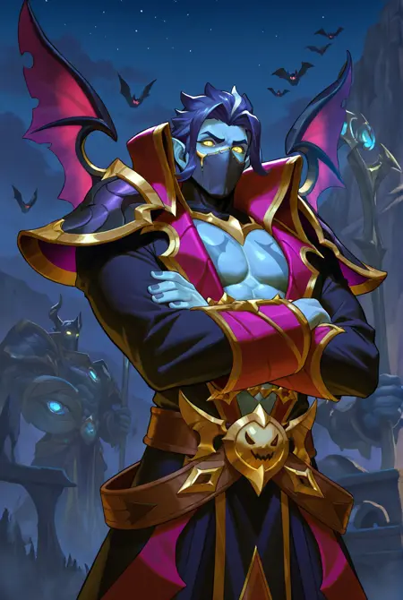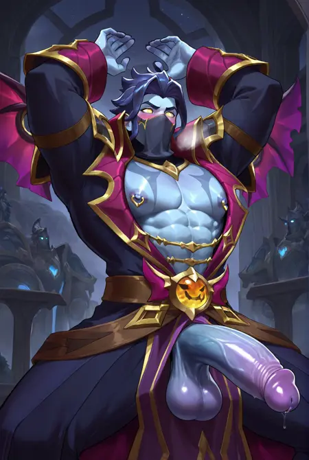 c0unt kassadin, 色付きの肌, 青い肌, 腹筋, 翼, 胸筋, 黄色い目, 輝く目, マスク, 長袖, アーマー, 肩アーマー, ベルト, ローブ, 剣, 腕に差した剣
