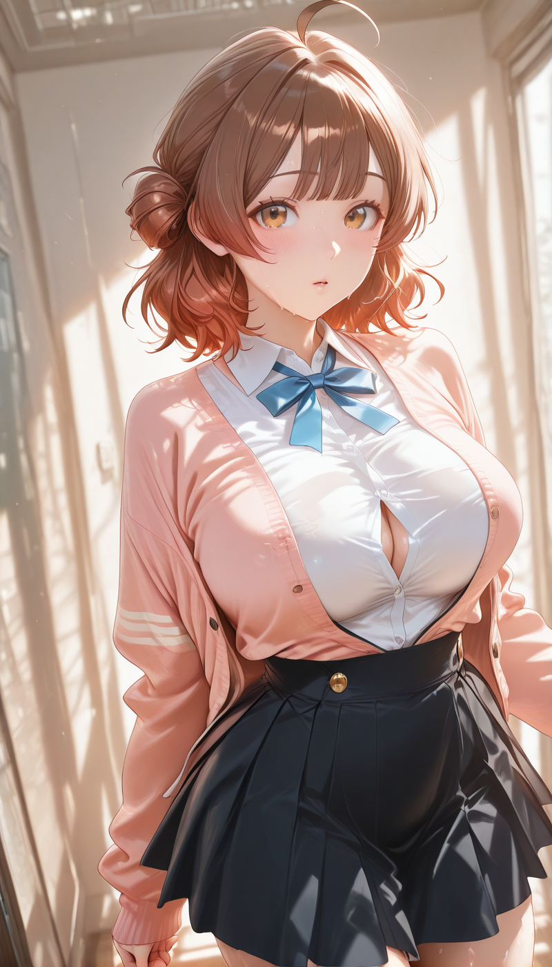 IMHanaUme、胸、短髪、茶髪、中程度の胸、黄色い目、あほ毛、中程度の髪、橙色の目、茶色の目、髪の結び目、グラデーション髪、単一の髪の結び目、片側の髪の結び目、波状の髪、多色髪、