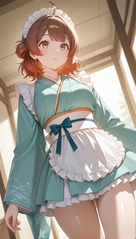 長袖、太もも、フリル、和服、広袖、着物、エプロン、メイド、帯、メイドヘアアクセサリー、帯、白いエプロン、メイドエプロン、フリル付きエプロン、青い着物、ウェイター、短い着物、緑の着物、WAメイド、アクア色の着物、リボン、青いリボン、ウエストエプロン