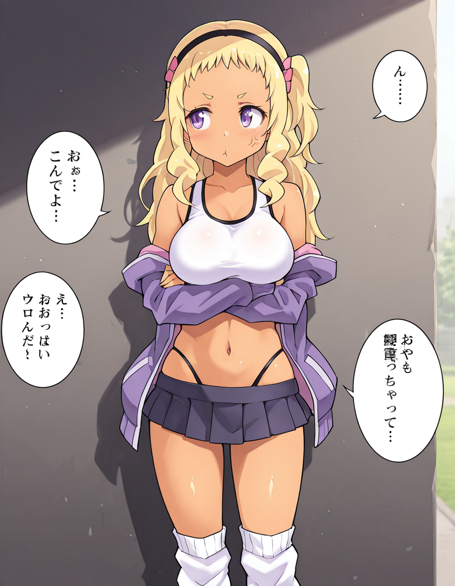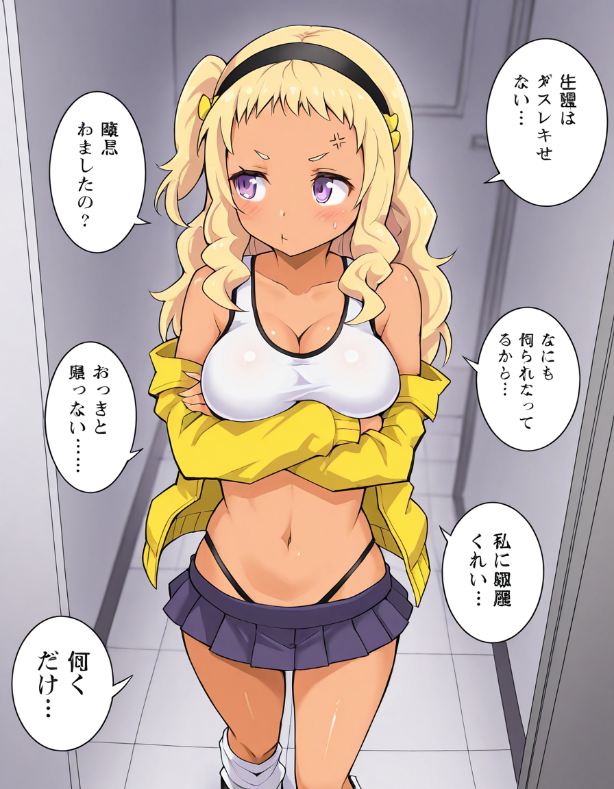 トレーニングプロンプト: AiharaSakuya, dark skin, dark-skinned female, hairband, hairbow, long hair, short bangs, shortstack, large breasts, gyaru, blonde hair, purple eyes