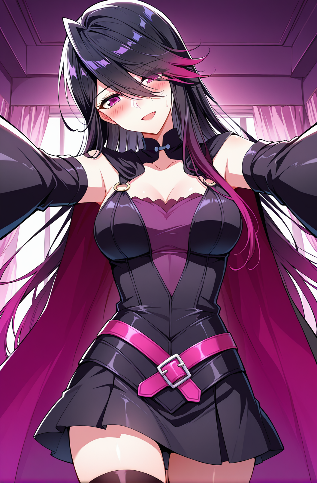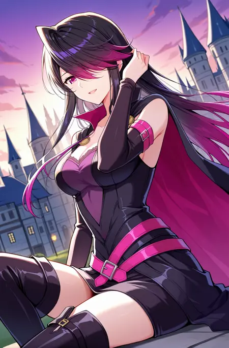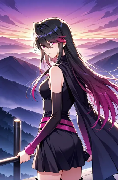 Xiatao2、1人Girl、シングル、ロングヘア、ストレートヘア、レイヤードヘア、黒髪、グラデーションヘア、ダークマゼンタグラデーション、ダークマゼンタの先端、髪が目を覆う、ロングバンス、 swept バンス、サイドサウェイプバンス、髪が目の間にある、マゼンタ色の目、