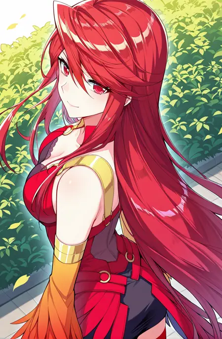 Xiaotao1、1人Girl、シングル、ロングヘア、流れるような髪、赤髪、アホ毛、swept バンス、赤い目、