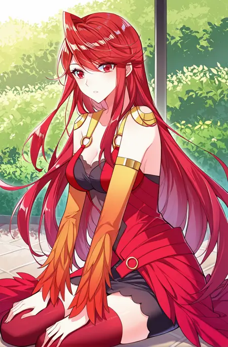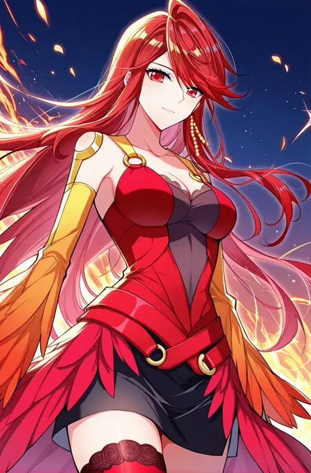 Xiaotao1_outfit、赤い衣装、炎をテーマにした衣装、非対称なドレス、ハイスリットドレス、ノースリーブドレス、バストの露出、黒いメッシュ胸、装飾的なレース、ゴールドのアクセント、ゴールドのリングストラップ、オレンジ色のフェザーの袖、白い取り外し可能な袖、太ももハイ、赤い太ももハイ、スカート下の黒いショートスカート