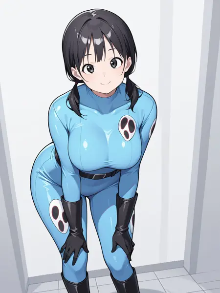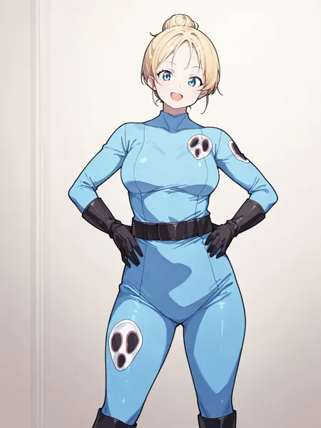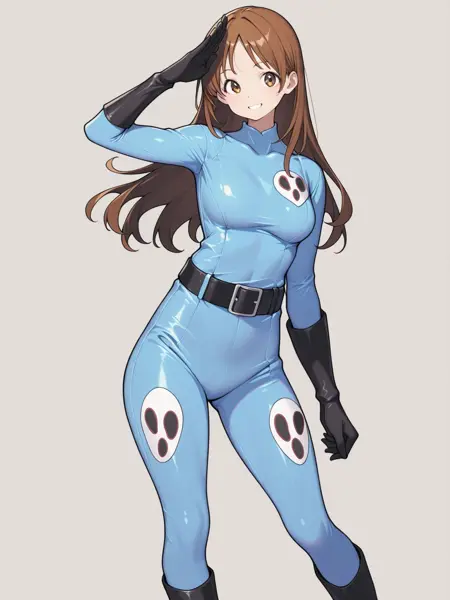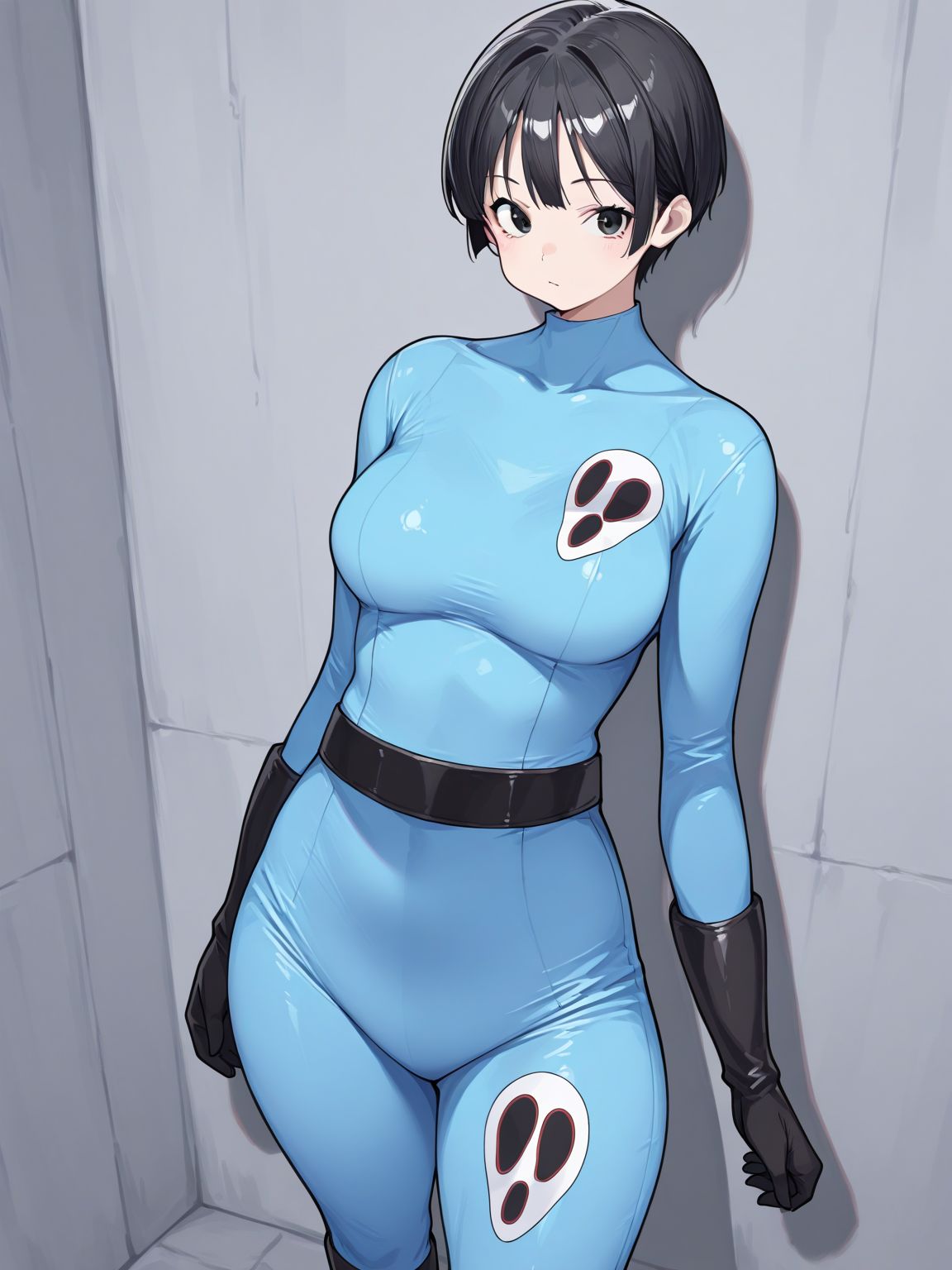 蓝色紧身衣、黑色手套、黑色腰带、黑色靴子,