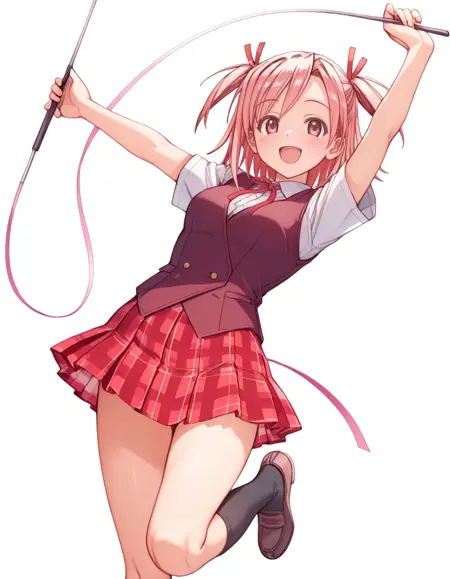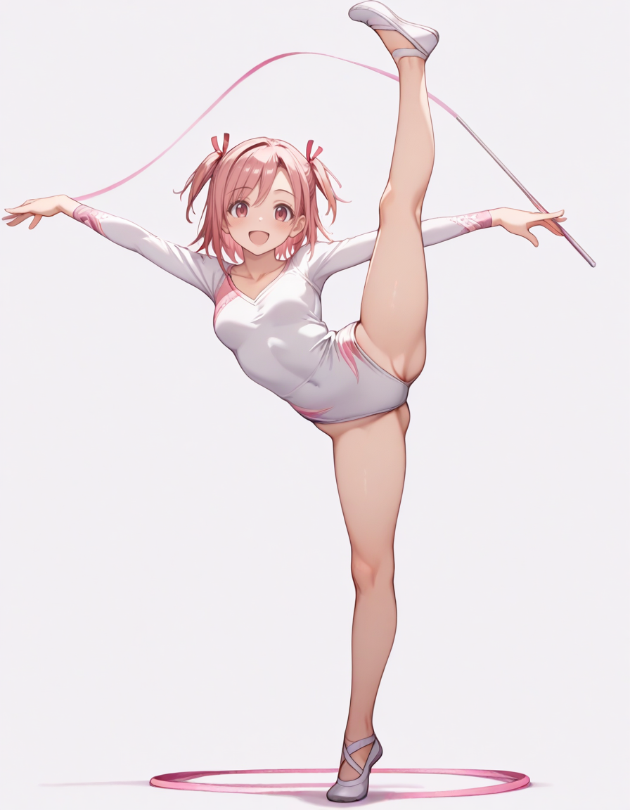 若在关键词中加入体操相关的 rhythmic gymnastics,模型可能会自动添加彩带或棒子,或做出跳跃、翻腾等动作,建议多加尝试。